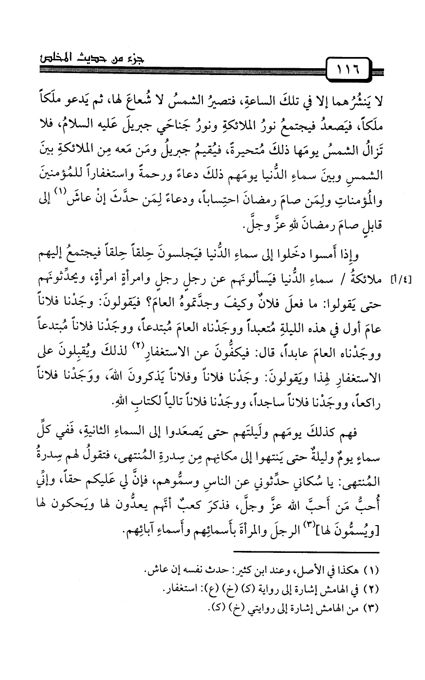 فلا تَزالُ الملائكةُ هَكذا حتى يطلُعَ الفجرُ، فأولُ مَن يصعدُ جبريلُ حتى يكونَ في الوجهِ الأَعلى مِن الشمسِ حتى يبسطَ جناحَهُ، وله جَناحانِ أَخضرانِ