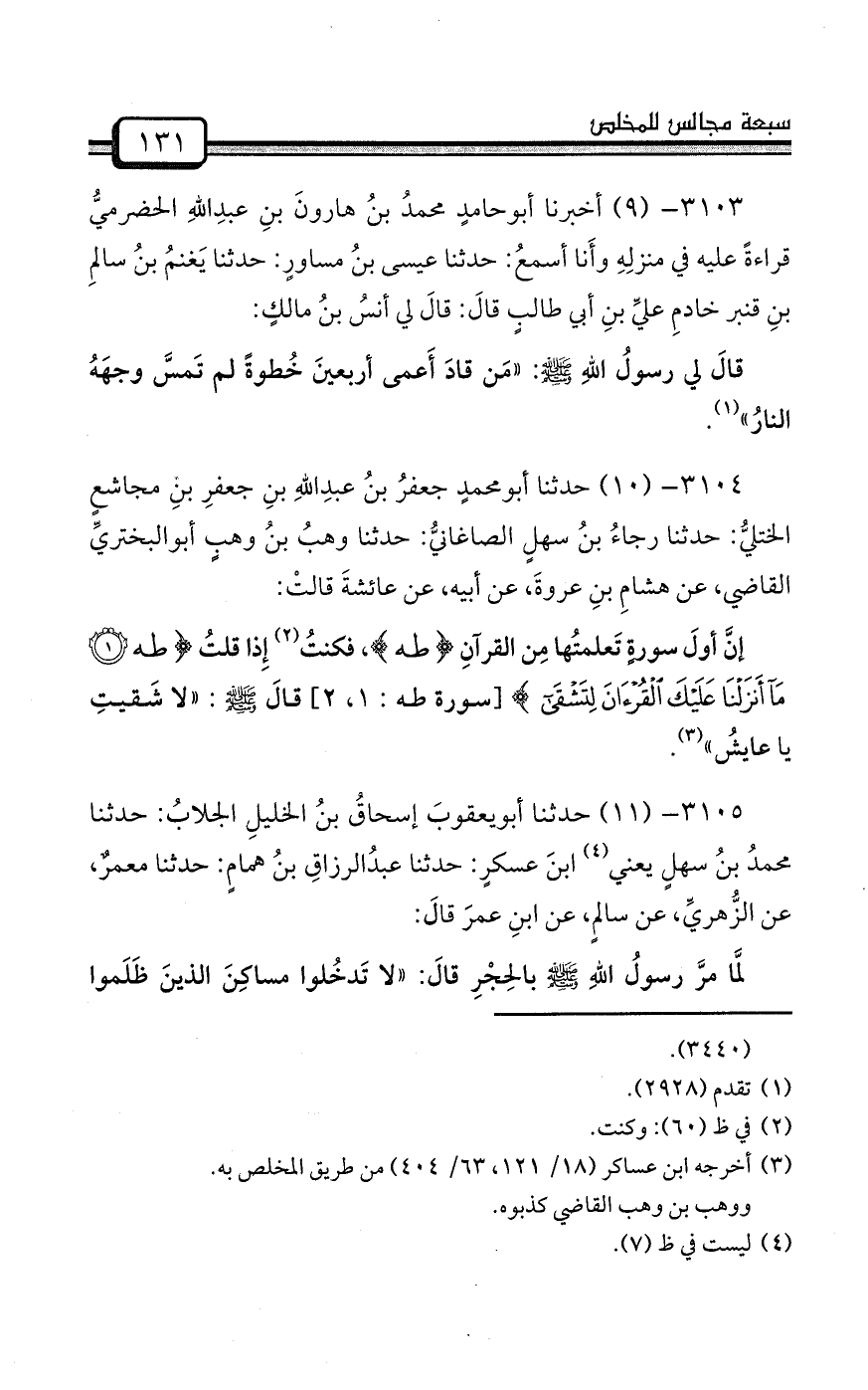 3101- (7) حدثنا يحيى بنُ محمدِ بنِ صاعدٍ أبومحمدٍ إملاءً قالَ: حدثنا محمدُ بنُ زنبورٍ المكيُّ: حدثنا الحارثُ بنُ عميرٍ، عن حميدٍ، عن أنسٍ قالَ: