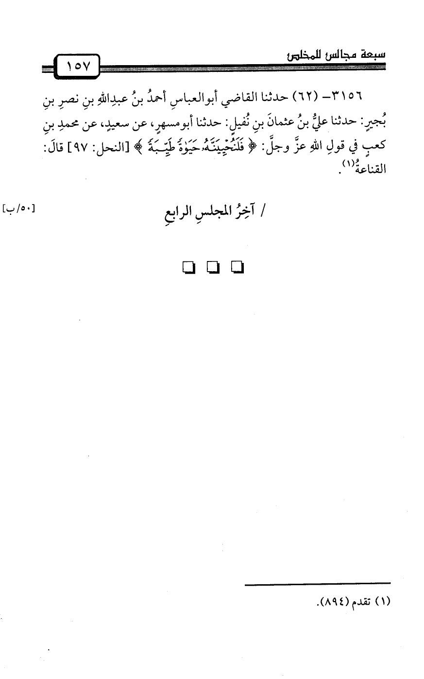 3155- (61) حدثنا أبوبكرٍ أحمدُ بنُ محمدِ بنِ أبي شيبةَ: حدثنا العباسُ بنُ محمدٍ مَولى بَني هاشمٍ: حدثنا أبوسلمةَ منصورُ بنُ سلمةَ الخزاعيُّ: أخبرنا شبيبُ بنُ شيبةَ قالَ: سمعتُ ابنَ سيرينَ يقولُ: الكلامُ أوسعُ مِن أَن يَكذبَ فيه (¬4) ظريفٌ.