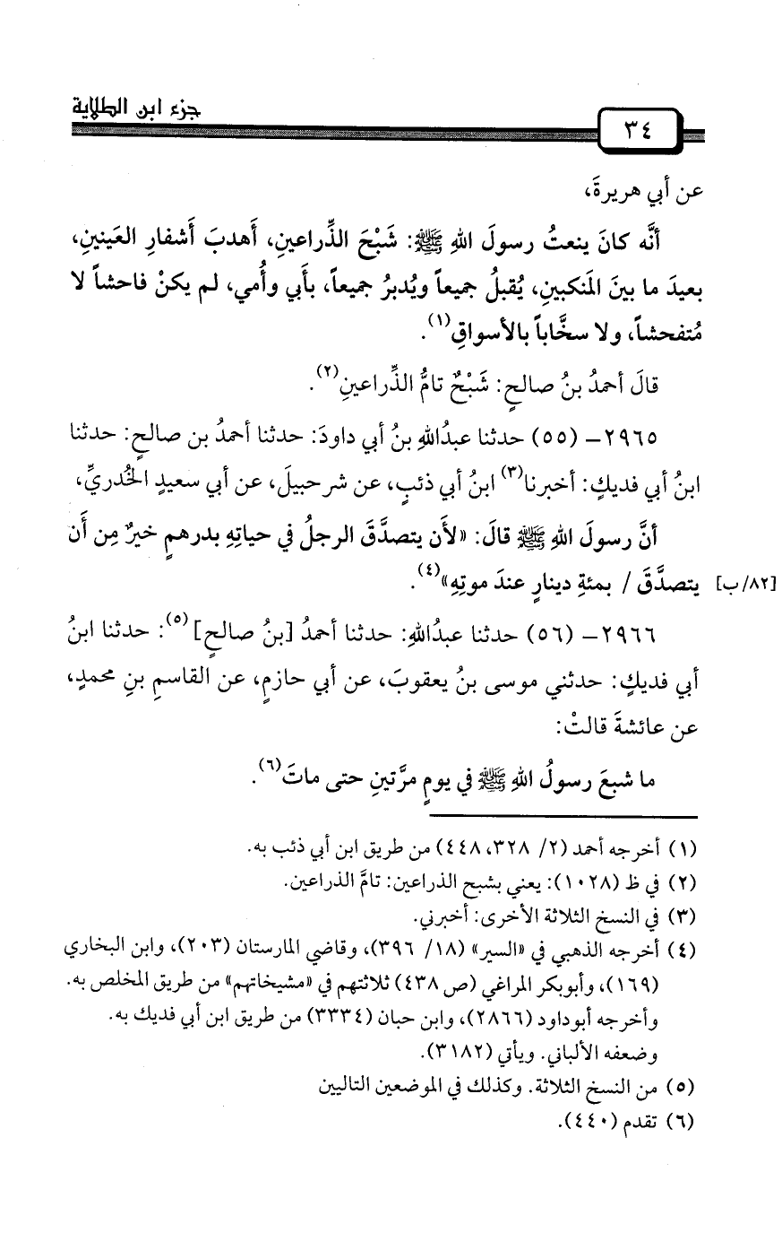 2964- (54) حدثنا عبدُاللهِ بنُ سليمانَ: حدثنا أحمدُ بنُ صالحٍ: حدثنا ابنُ أبي فديكٍ: حدثنا ابنُ أبي ذئبٍ، عن صالحِ بنِ أبي صالحٍ مَولى التَّوأمةِ،