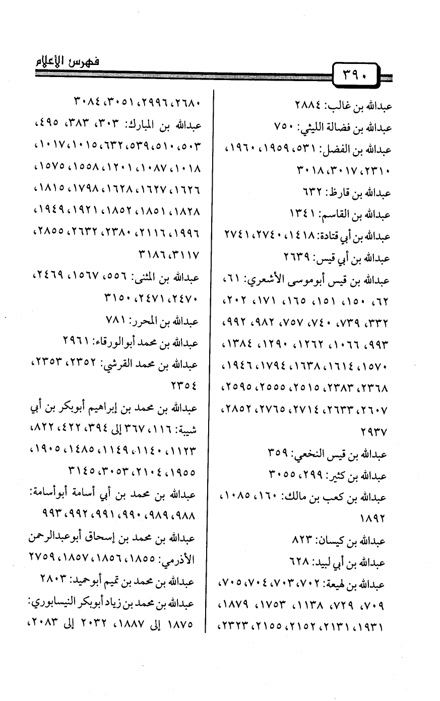 عبد الله بن عمرو بن العاص: 33، 172، 301، 317، 420، 421، 422، 423، 424، 493، 587، 692، 730، 847، 869، 870، 923، 960، 1042، 1043، 1080، 1135، 1138، 1200، 1213، 1254، 1259، 1274، 1275، 1371، 1437، 1467، 1665، 1706، 1774، 1879، 1880، 2048، 2057، 2099، 2155، 2210، 2302، 2323، 2588، 2599، 2660، 2744، 2745، 2789، 2850، 3051، 3061، 3170