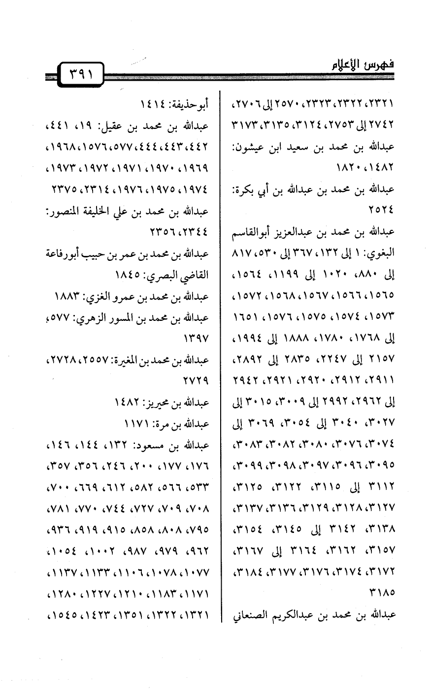 عبد الله بن محمد بن إبراهيم أبوبكر بن أبي شيبة: 116، 367 إلى 394، 422، 822، 1123، 1140، 1149، 1485، 1905، 1955، 2104، 3053، 3145