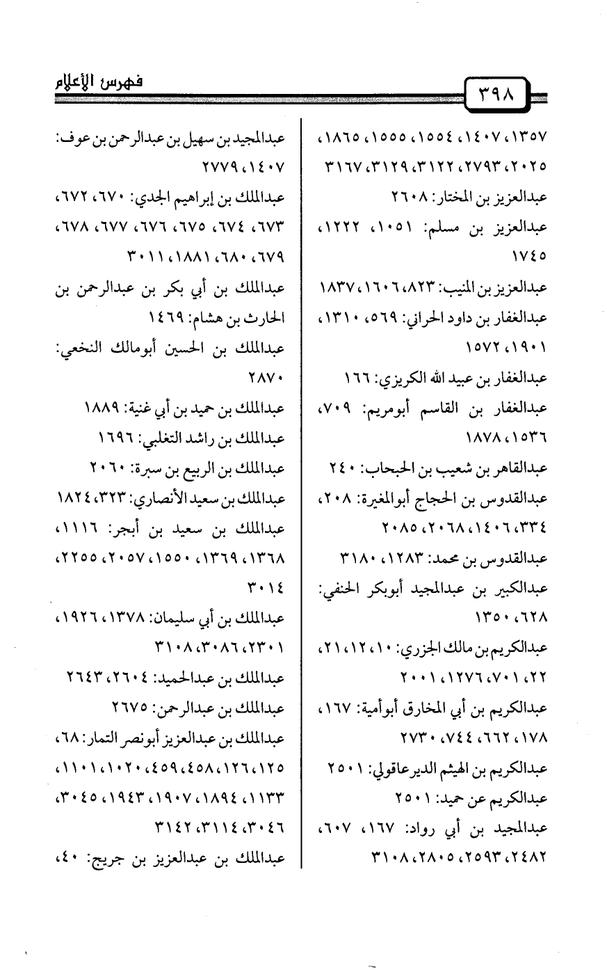 عبد العزيز بن صهيب: 1026، 1297، 1359، 1360، 1361، 1362، 1366، 2264، 2265، 2389، 2422 إلى 2466، 2583، 2746، 3120