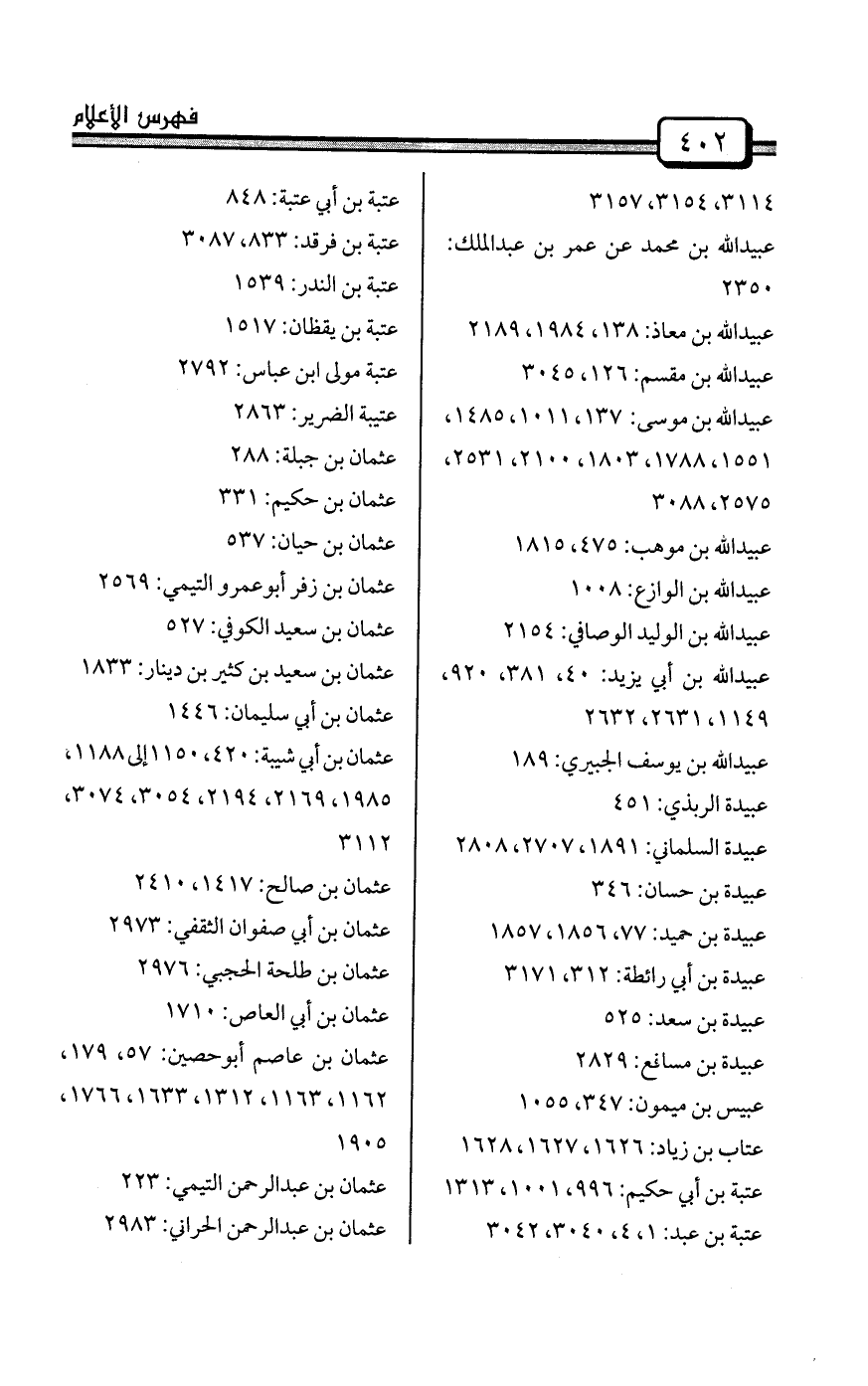 عبيد الله بن عمر العمري: 258، 289، 302، 303، 304، 305، 306، 307، 350، 425 إلى 435، 449، 593، 607، 637، 638، 656، 738، 777، 967، 1044، 1062، 1184، 1188، 1191، 1192، 1207، 1303، 1328، 1345، 1433، 1434، 1439، 1558، 1647، 1689، 1747، 1752، 1757، 1823، 1838، 1840، 2027، 2178، 2274، 2316، 2340، 2362، 2369، 2529، 2573، 2653، 2793، 2794، 2817، 2924، 2939، 3106