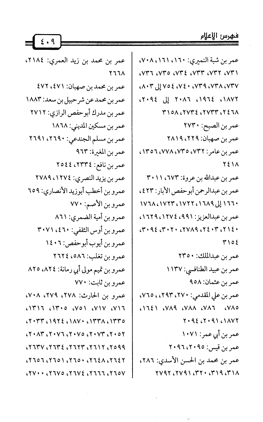 عمر بن الخطاب: 19، 58، 70، 204، 311، 338، 397، 486، 599، 609، 625، 626، 664، 754، 784، 864، 948، 949، 963، 1031، 1032، 1144، 1170، 1214، 1276، 1388، 1410، 1411، 1412، 1413، 1414، 1454، 1457إلى 1466، 1635، 1641، 1716، 1737، 1748، 1777، 1779، 1881، 1921، 1945، 1976، 2031، 2097، 2190، 2243، 2248، 2249، 2253، 2290، 2293، 2301، 2332، 2338، 2397، 2405 إلى 2414، 2419، 2420، 2472، 2500، 2501، 2535، 2655، 2736، 2806، 2881، 2993، 3039، 3059، 3125
