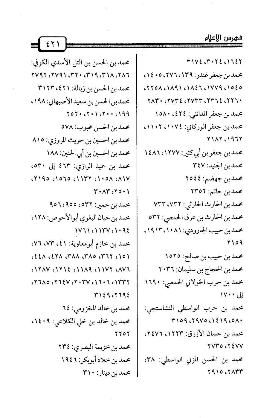 محمد بن بشار بندار: 139، 143، 276، 564، 1405، 1427، 1531، 1545، 1779، 1839، 1863، 1864، 2258، 2260، 2275، 2276، 2415، 2770، 2775، 2825، 2894، 2898، 2899
