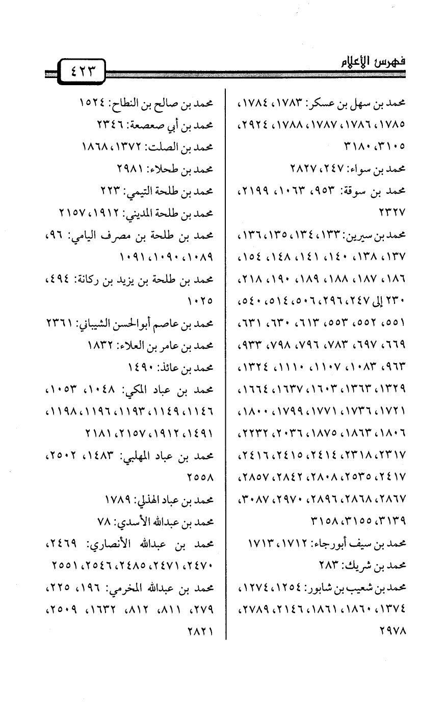 محمد بن سليمان بن حبيب المصيصي لوين: 197، 298، 321، 322، 339، 340، 545، 546، 547، 548، 554، 555، 556، 557، 558، 579، 623، 624، 632، 640، 641، 650، 651، 663، 844، 845، 846، 1238، 1239، 1246، 1247، 1248، 1249، 1261، 1262، 1271، 1294، 1311، 1312، 1319، 1320، 1333، 1368، 1377، 1421، 1473، 1474، 1501، 1566، 1567، 1574، 1770، 1793، 1826، 1827، 1849، 1850، 1942، 2263، 2264، 2265، 2266، 2270، 2271، 2279، 2294، 2295، 3161، 3175