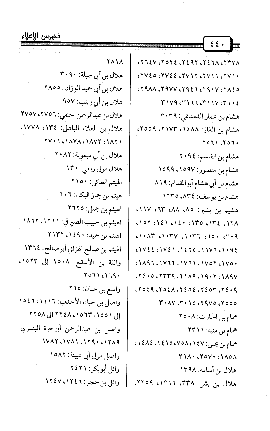 هشام بن حسان: 138، 140، 190، 218، 232، 247، 295، 296، 514، 551، 552، 553، 697، 798، 933، 963، 1345، 1450، 1475، 1721، 1736، 1771، 1906، 2122، 2270، 2468، 2483، 2726، 2808، 2857، 2867، 2868، 2895، 3139، 3158، 3165، 3166