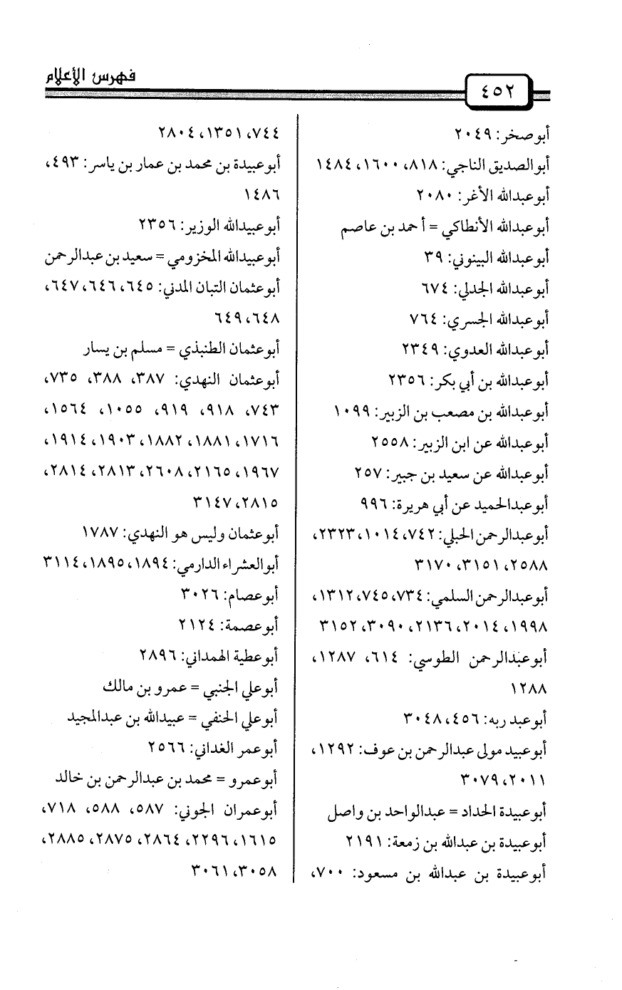 أبوسلمة بن عبد الرحمن بن عوف: 68، 217، 260، 277، 329، 395 إلى 418، 471، 472، 499، 501، 557، 581، 598، 636، 640، 664، 684، 695، 785، 819، 846، 937، 938، 955، 956، 1032، 1132، 1218، 1225، 1253، 1269، 1272، 1306، 1333، 1396، 1398، 1418، 1427، 1470، 1501، 1552، 1555، 1735، 1758، 1807، 1808، 1809، 1810، 1811، 1855، 1864، 1870، 1888، 1911، 1940، 2018، 2019، 2068، 2079، 2080، 2085، 2158، 2175، 2182، 2183، 2188، 2224، 2384، 2577، 2578، 2579، 2606، 2658، 2754، 2755، 2756، 2757، 2770، 2771، 2775، 2776، 2777، 2778، 2779، 2790، 2818، 2819، 2911، 2953، 2984، 3008، 3009، 3056، 3169، 3180