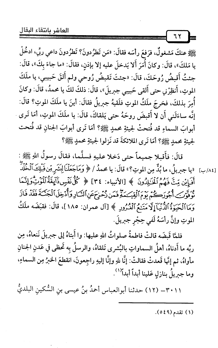 3010- (11) حدثنا أبومحمدٍ يحيى بنُ محمدِ بنِ صاعدٍ قالَ: حدثنا محمدُ بنُ يحيى بنِ عبدِالكريمِ الأزديُّ بالبصرةِ سنةَ خمسينَ ومئتينِ وقدمَ علينا بغدادَ قبلَ هذا الوقتِ وكَتبنا عنه، قالَ: حدثنا أصرمُ بنُ حوشبٍ قالَ: حدثنا المباركُ بنُ فَضالةَ، عن ثابتٍ البُنانيِّ، عن أنسِ بنِ مالكٍ قالَ: