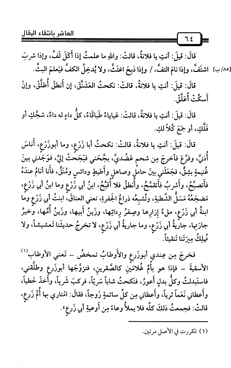 قالَ: قيلَ: أنتِ يا فلانةُ، قالتْ: نكحتُ مالكاً، وما مالكٌ، له إبلٌ كثيراتُ المَبارِكِ، قَليلاتُ المَسارحِ، إذا سمعْنَ صوتَ المِزهَرِ أيقَنَّ أنهنَّ هوالِكُ.