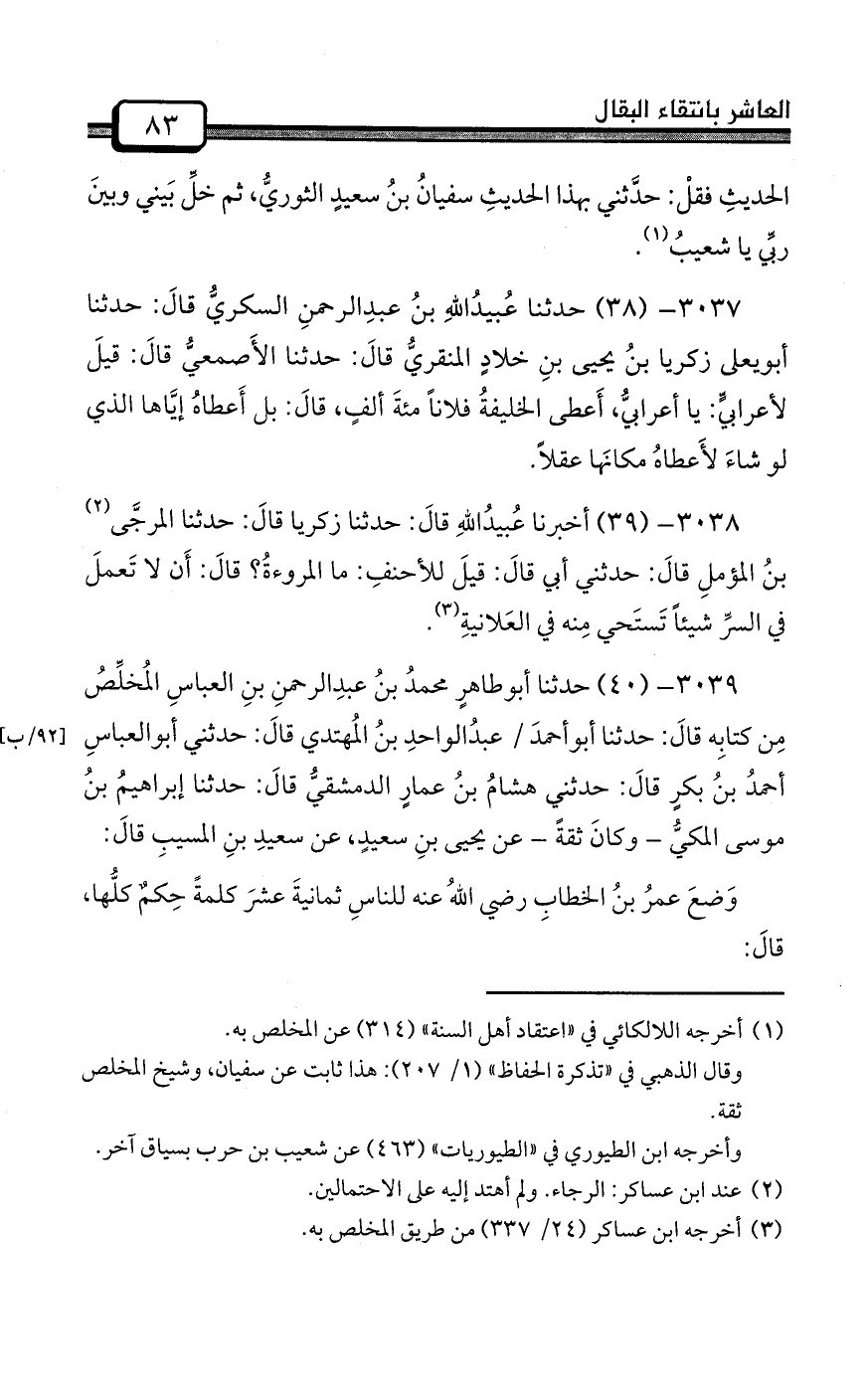 يا شعيبُ، لا ينفعُكَ ما كتبتُ حتى تَرى الصلاةَ خلفَ كلِّ برٍّ وفاجرٍ، والحجُّ والجهادُ ماضٍ إلى يومِ القيامةِ، والصبرُ تحتَ لواءِ السلطانِ جارَ أم عدلَ، قالَ شعيبٌ: قلتُ لسفيانَ: يا أبا عبدِاللهِ، الصلاةَ كلَّها؟ قالَ: لا ولكنْ صلاةُ الجمعةِ والعيدينِ، صلِّ خلفَ مَن أدركتَ، وأمَّا سائرُ ذلكَ فأنتَ مُخيرٌ ألا تُصلِّ إلا خلفَ مَن تَثقُ به وتعلمُ أنَّه مِن أهلِ السُّنةِ والجماعةِ.