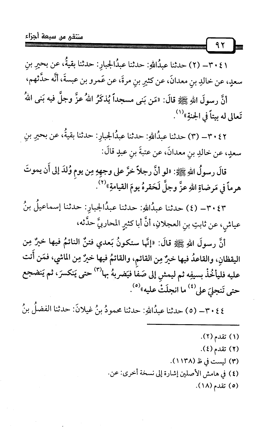 3040- (1) أخبرنا (¬2) أبوالقاسم عبدُاللهِ بنُ محمدِ بنِ عبدِالعزيزِ البغويُّ سنةَ خمسَ عشرةَ وثلاثِمئةٍ: حدثنا عبدُالجبارِ بنُ عاصمٍ أبوطالبٍ النسائيُّ: حدثنا بقيةُ بنُ الوليدِ: [حدثنا الحسنُ بنُ أيوبَ] (¬3) : حدثني عبدُاللهِ بنُ ناسحٍ الحضرميُّ قالَ: سمعتُ عتبةَ بنَ عبدٍ صاحبَ رسولِ اللهِ صلى الله عليه وسلم يقولُ: