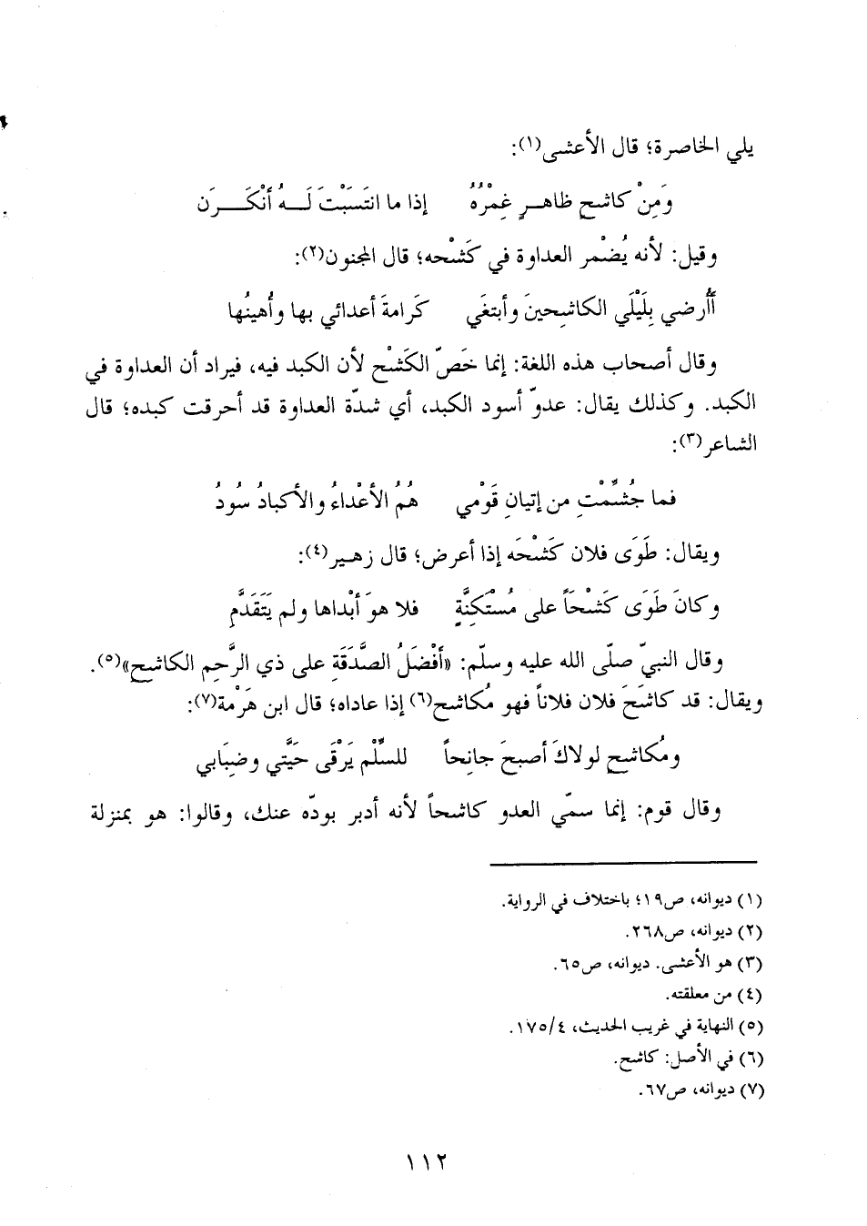 وقال النبي صلى الله عليه وسلم: "أفضل الصدقة على ذي الرحم الكاشح". ويقال: قد كاشح فلان فلاناً فهو مُكاشح إذا عاداه؛ قال ابن هرمة:
