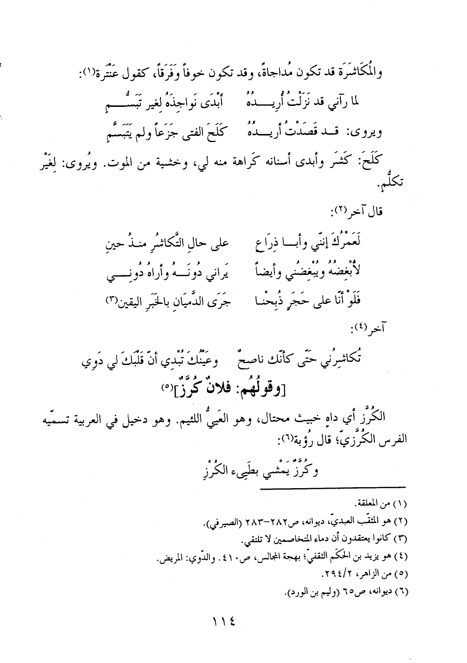 والمُكاشرة قد تكون مداجاة، وقد تكون خوفاً وفرقاً، كقول عنترة: