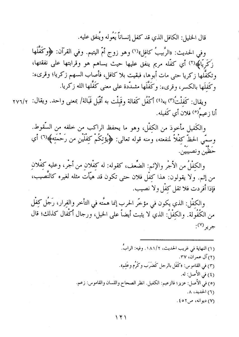 وفي الحديث: "الربيب كافل" وهو زوج أم اليتيم. وفي القرآن: {وَكَفَّلَهَا زَكَرِيَّا} أي كفله مريم ينفق عليها حيث يساهم هو وقرابتها على نفقتها، وتكفَّلها زكريا حتى مات أبوها، فبقيت بلا كافل، فأصاب السهم زكريا؛ وقرئ: وكفِلَها بالكسر، وقرئ: وكفَّلها مشددة على معنى كفَّلها الله زكريا.