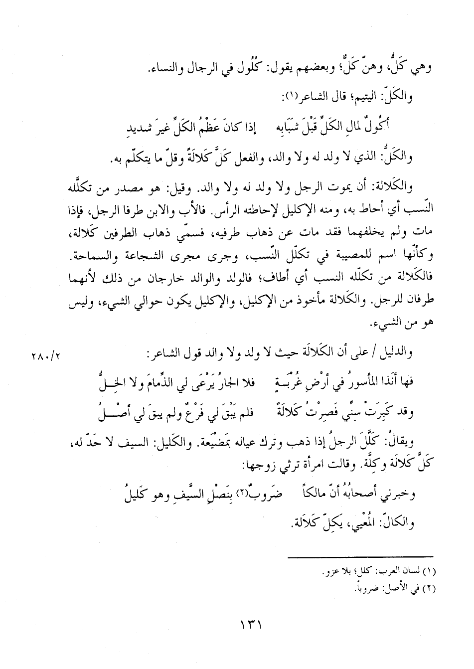والكلالة: أن يموت الرجل ولا ولد له ولا والد. وقيل: هو مصدر من تكلله النسب أي أحاط به، ومنه الإكليل لإحاطته الرأس. فالأب والابن طرفا الرجل، فإذا مات ولم يخلفهما فقد مات عن ذهاب طرفيه، فسمي ذهاب الطرفين كلالة، وكأنها اسم للمصيبة في تكلل النسب، وجرى مجرى الشجاعة والسماحة. فالكلالة من تكلله النسب أي أطاف؛ فالولد والوالد خارجان من ذلك لأنهما طرفان للرجل. والكلالة مأخوذ من الإكليل، والإكليل يكون حوالي الشيء، وليس هو من الشيء.
