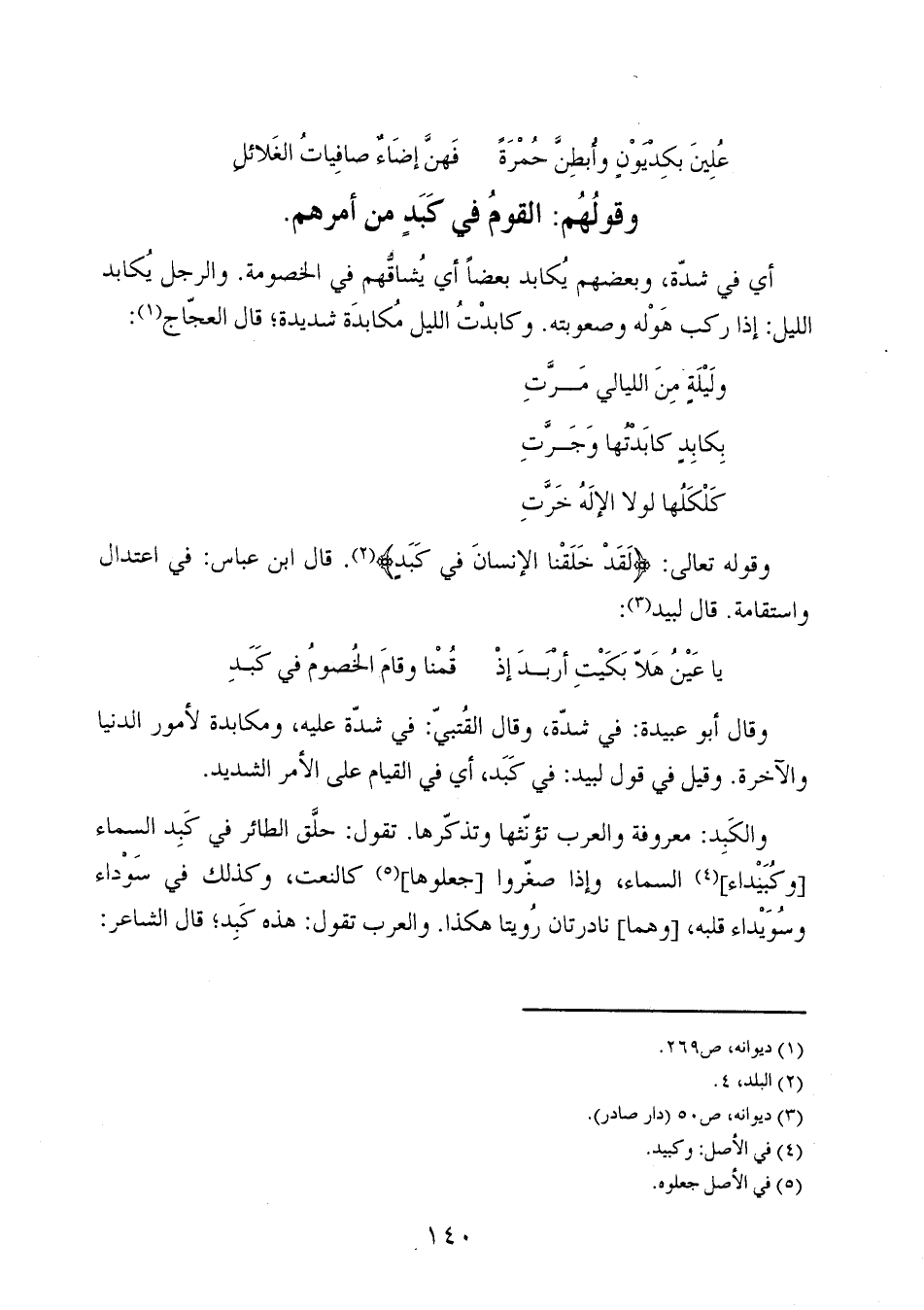 وقال أبو عبيدة: في شدة، وقال القُتبي: في شدة عليه، ومكابدة لأمور الدنيا والآخرة. وقيل في قول لبيد: في كبد، أي في القيام على الأمر الشديد.