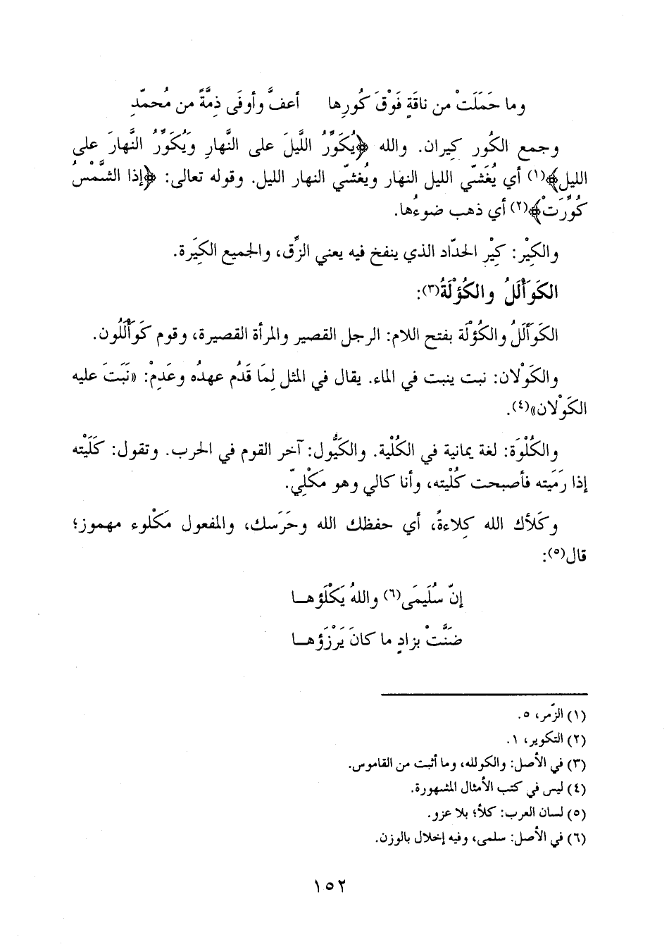 وجمع الكُور كيران. والله {يُكَوِّرُ اللَّيْلَ عَلَى النَّهَارِ وَيُكَوِّرُ النَّهَارَ عَلَى اللَّيْلِ} أي يغشي الليل النهار ويُغشي النهار الليل. وقوله تعالى: {إِذَا الشَّمْسُ كُوِّرَتْ} أي ذهب ضوءها.