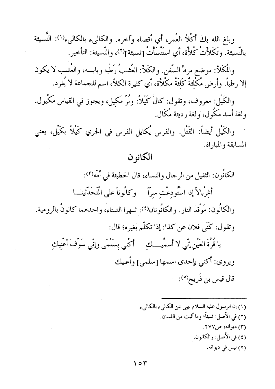 وبلغ الله بك أكلأ العمر، أي أقصاه وآخره. والكالئ بالكالئ: النسيئة بالنسيئة. وتكلأت كلأة، أي استنسأت [نسيئة]، والنسيئة: التأخير.