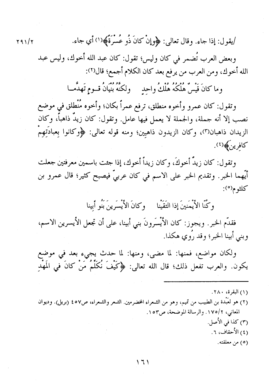 وتقول: كان زيد أخوك، وكان زيداً أخوك، إذا جئت باسمين معرفتين جعلت أيهما الخبر. وتقديم الخبر على الاسم في كان عربي فيصبح كثير؛ قال عمرو بن كلثوم: