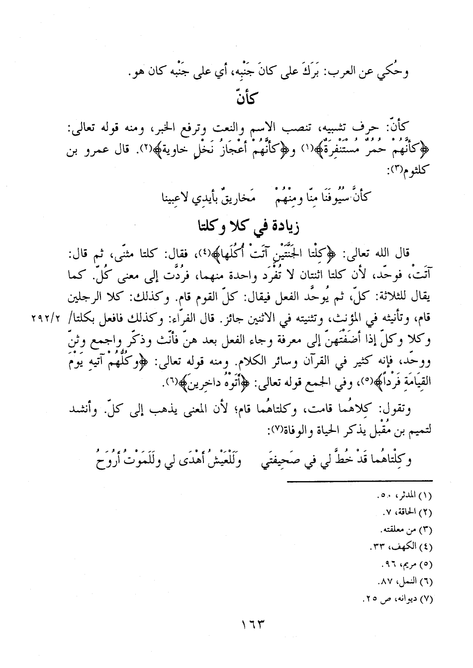 كأن: حرف تشبيه، تنصب الاسم والنعت وترفع الخبر، ومنه قوله تعالى: {كَأَنَّهُمْ حُمُرٌ مُسْتَنْفِرَةٌ} و {كَأَنَّهُمْ أَعْجَازُ نَخْلٍ خَاوِيَةٍ}. قال عمرو بن كلثوم: