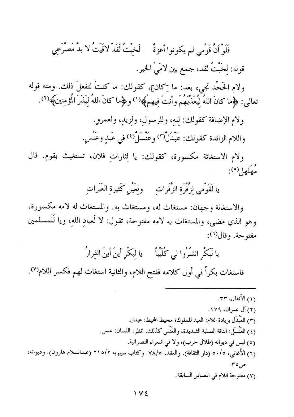 ولام الاستغاثة مكسورة، كقولك: يا لثارات فلان، تستغيث بقوم. قال مهلهل:
