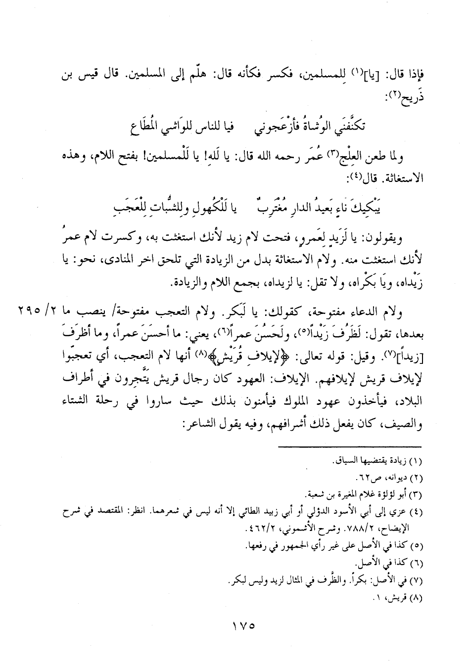 ولام الدعاء مفتوحة، كقولك: يا لبكر. ولام التعجب مفتوحة ينصب ما بعدها، تقول: لظرف زيداً، ولحسن عمراً، يعني: ما أحسن عمراً، وما أظرف [زيداً]. وقيل: قوله تعالى: {لإِيلافِ قُرَيْشٍ} أنها لام التعجب، أي تعجبوا لإيلاف قريش لإيلافهم. الإيلاف: العهود كان رجال قريش يتجرون في أطراف البلاد، فيأخذون عهود الملوك فيأمنون بذلك حيث ساروا في رحلة الشتاء والصيف، كان يفعل ذلك أشرافهم، وفيه يقول الشاعر: