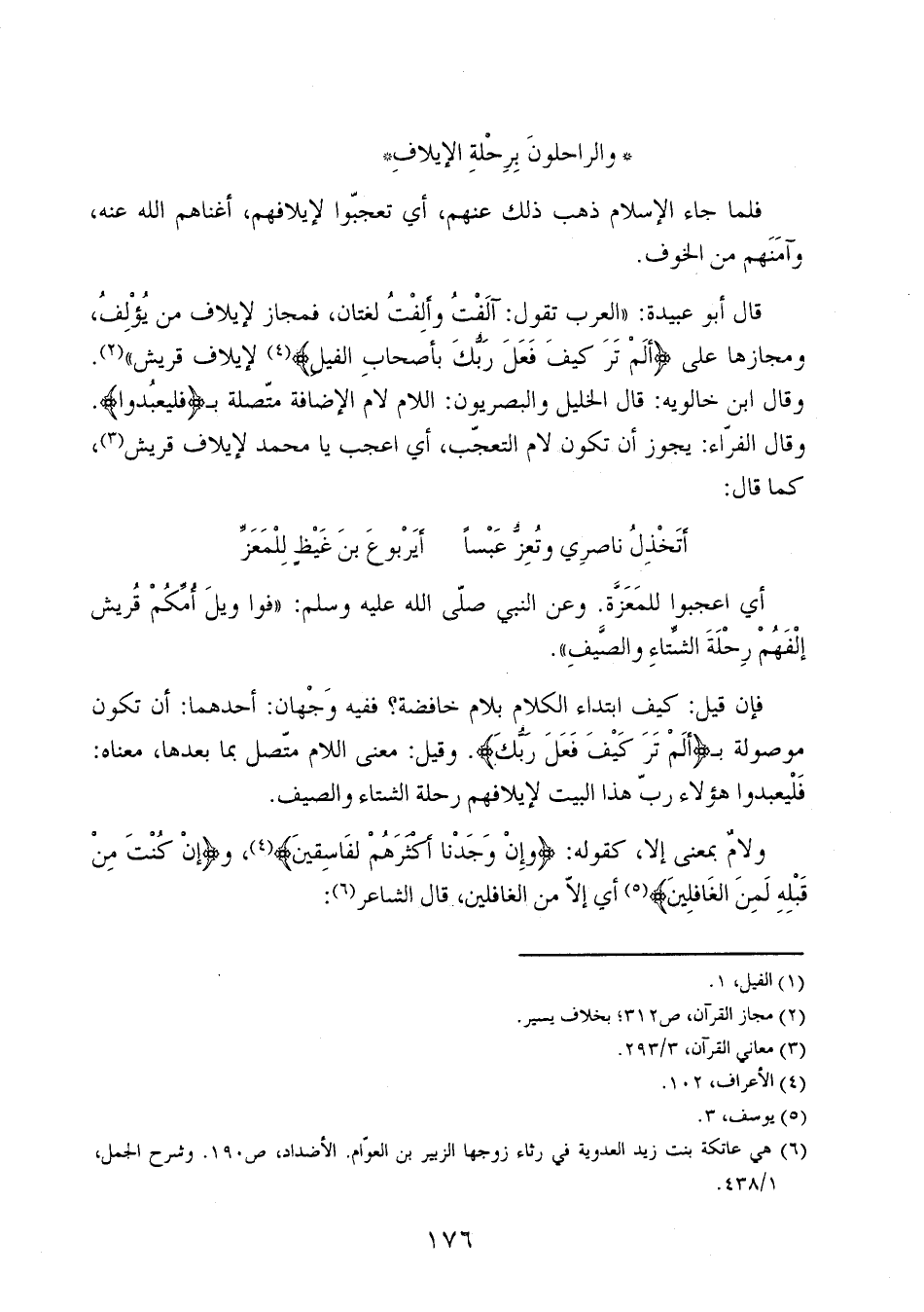 قال أبو عبيدة: "العرب تقول: آلفت والفت لغتان، فمجاز لإيلاف من يؤلف، ومجازها على {أَلَمْ تَرَى كَيْفَ فَعَلَ رَبُّكَ بِأَصْحَابِ الْفِيلِ} لإيلاف قريش". وقال ابن خالويه: قال الخليل والبصريون: اللام لام الإضافة متصلة بـ {فليعبُدوا}. وقال الفراء: يجوز أن تكون لام التعجب، أي اعجب يا محمد لإيلاف قريش، كما قال: