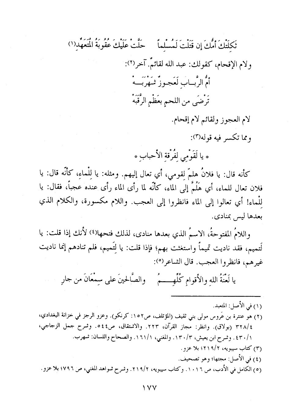 واللام المفتوحة، الاسم الذي بعدها منادى، لذلك فتحها لأنك إذا قلت: يا لتميم، فقد ناديت تميماً واستغثت بهم؛ فإذا قلت: يا لتميم، فلم تنادهم إنما ناديت غيرهم، فانظروا العجب. قال الشاعر: