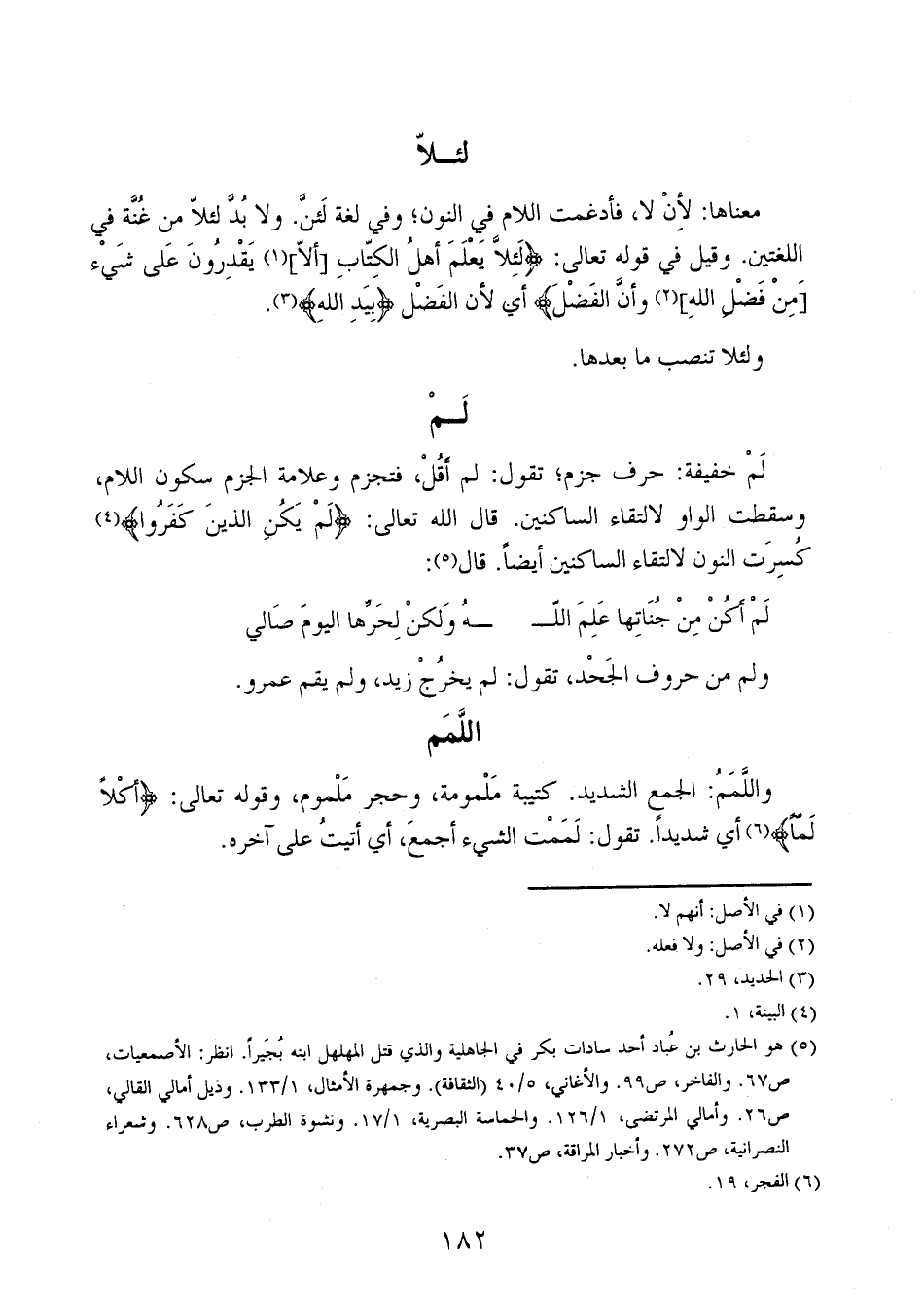 معناها: لأن لا، فأدغمت اللام في النون؛ وفي لغة لئن. ولابد لئلا من غُنَّة في اللغتين. وقيل في قوله تعالى: {لَئِلاَّ يَعْلَمَ أَهْلُ الْكِتَابِ [أَلاَّ] يَقْدِرُونَ عَلَى شَيْءٍ [مِنْ فَضْلِ اللَّهِ] وَأَنَّ الْفَضْلَ} أي لأن الفضل {بِيَدِ اللهِ}.