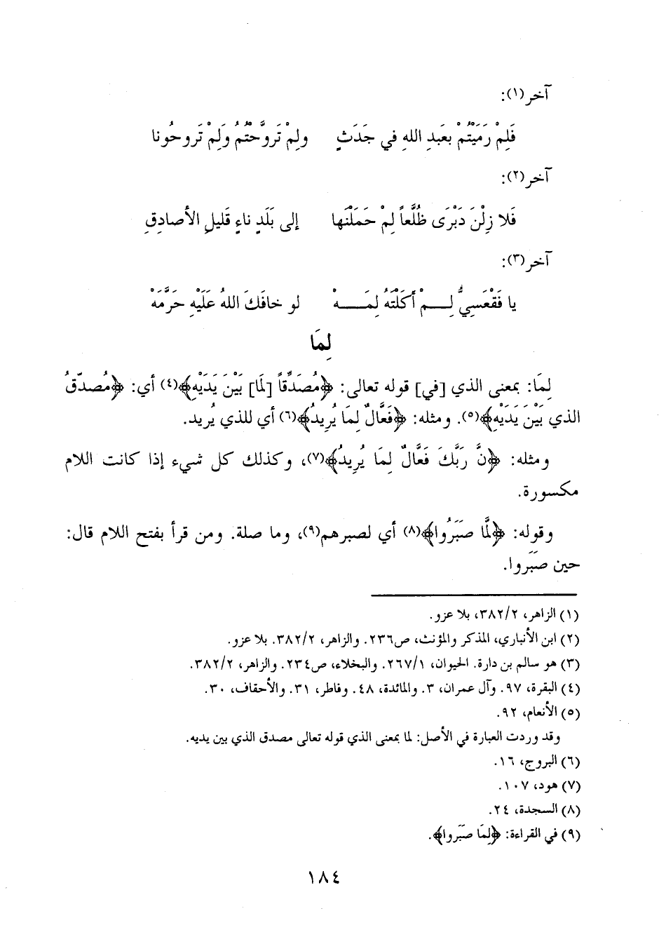 لِمَا: بمعنى الذي [في] قوله تعالى: {مُصَدِّقاً [لِمَا] بَيْنَ يَدَيْهِ} أي: {مُصَدِّقُ الَّذِي بَيْنَ يَدَيْهِ}. ومثله: {فَعَّالٌ لِمَا يُرِيدُ} أي للذي يريد.