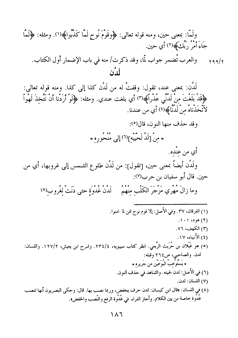 ولَدُن أيضاً بمعنى حين، [تقول]: من لدُن طلوع الشمس إلى غروبها، أي من حين. قال أبو سفيان بن حرب: