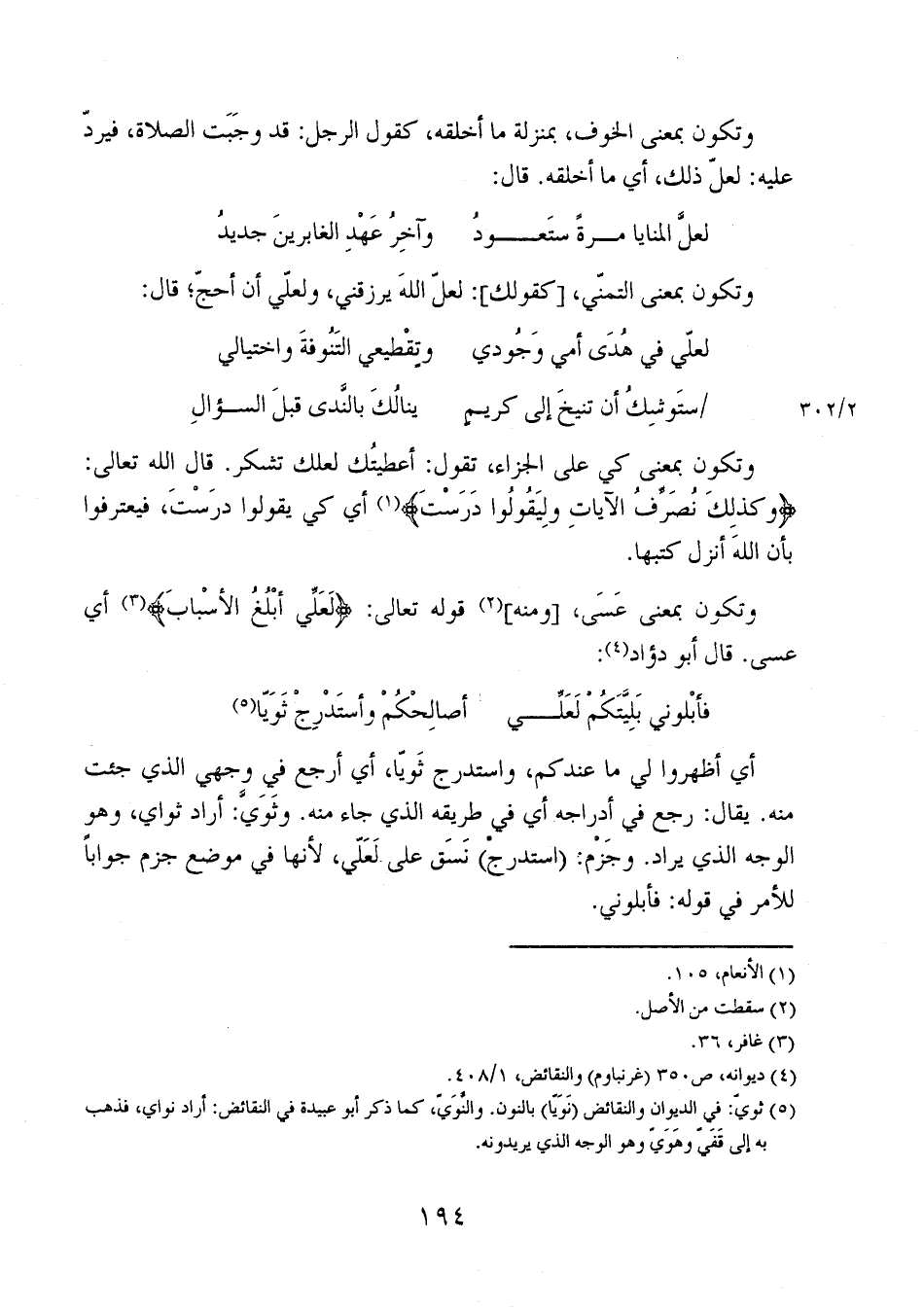 وتكون بمعنى عسى، [ومنه] قوله تعالى: {لَعَلِّي أَبْلُغُ الأَسْبَابَ} أي عسى. قال أبو دؤاد: