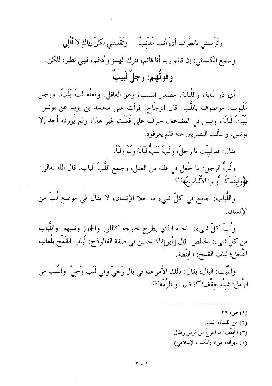 أي ذو لبابة، واللبابة: مصدر اللبيب، وهو العاقل. وفعله لب يلب. ورجل ملبوب: موصوف باللب. قال الزجاج: قرأت على محمد بن يزيد عن يونس: لببت لبابة، وليس في المضاعف حرف على فعلت غير هذا، ولم يورده أحد إلا يونس. وسأت البصريين عنه فلم يعرفوه.