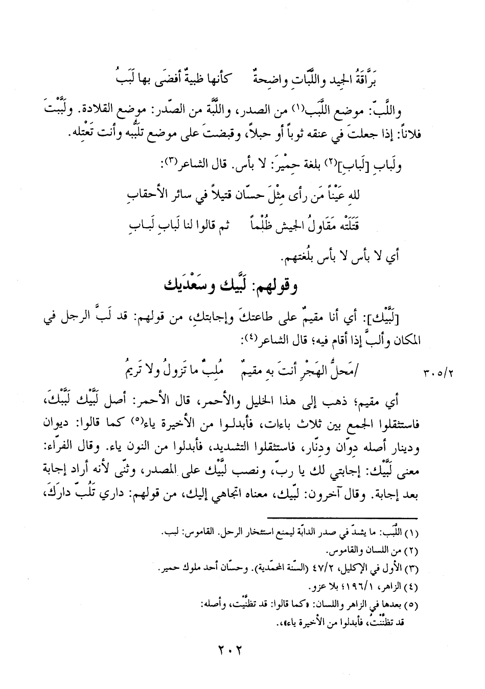 [لبيك]: أي أنا مقيم على طاعتك وإجابتك، من قولهم: قد لبَّ الرجل في المكان وألبَّ إذا أقام فيه؛ قال الشاعر:
