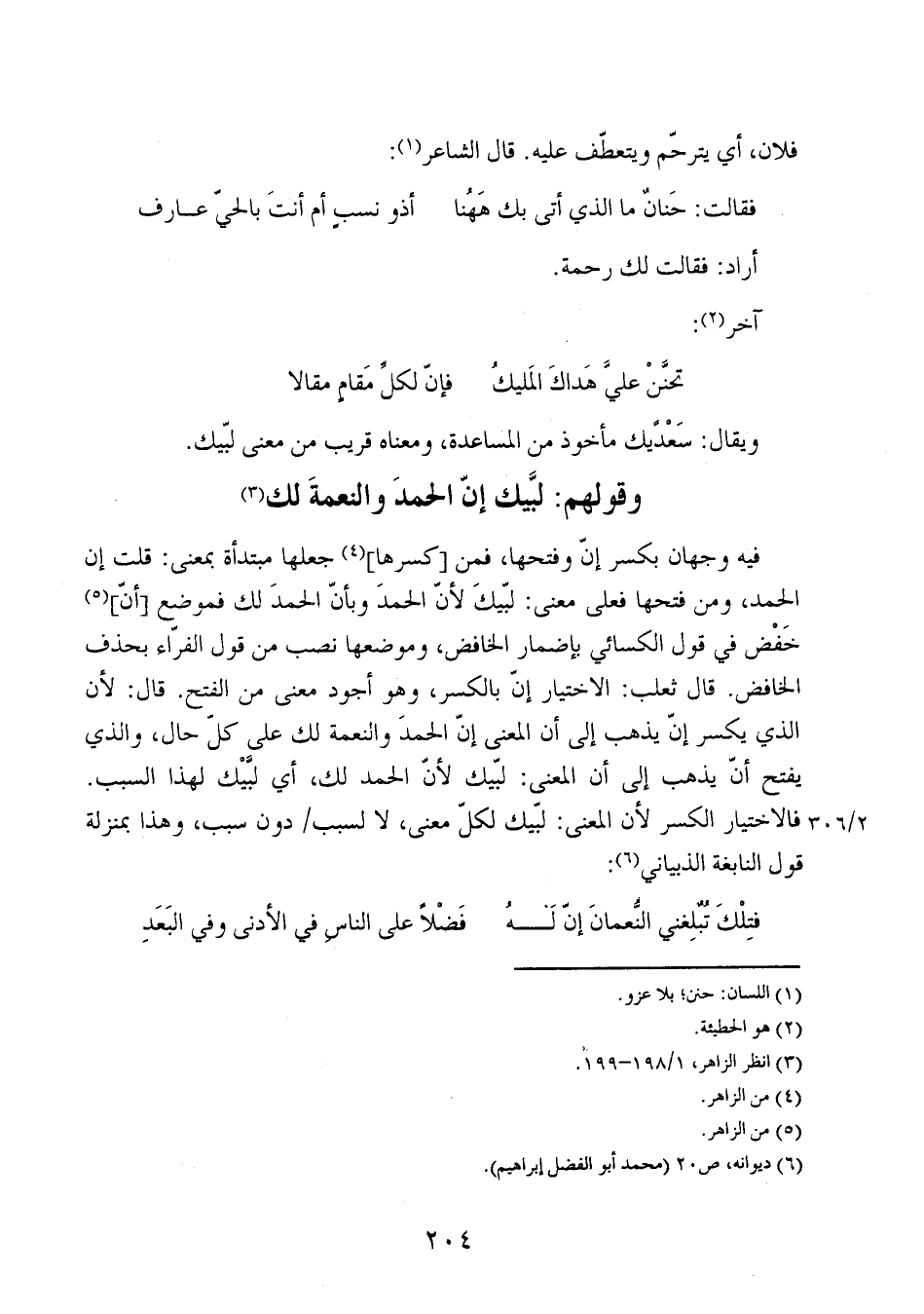 فيه وجهان بكسر إن وفتحها، فمن [كسرها] جعلها مبتدأة بمعنى: قلت إن الحمد، ومن فتحها فعلى معنى: لبيك لأن الحمد وبأن الحمد لك فموضع [أن] خفض في قول الكسائي بإضمار الخافض، وموضعها نصب من قول الفراء بحذف الخافض. قال ثعلب: الاختيار إن بالكسر، وهو أجود معنى من الفتح. قال: لأن الذي يكسر إن يذهب إلى أن المعنى إن الحمد والنعمة لك على كل حال، والذي يفتح أن يذهب إلى أن المعنى: لبيك لأن الحمد لك، أي لبيك لهذا السبب. فالاختيار الكسر لأن المعنى: لبيك لكل معنى، لا لسبب دون سبب، وهذا بمنزلة قول النابغة الذبياني: