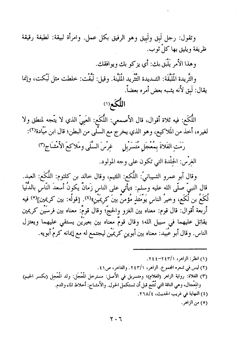 وقال أبو عمرو الشيباني: اللكع: اللئيم، وقال خالد بن كلثوم: اللكع: العبد. قال النبي صلى الله عليه وسلم: "يأتي على الناس زمان يكون أسعد الناس بالدنيا لُكَعُ بن لكع، وخير الناس يومئذ مؤمن بين كريمين". [قوله: بين كريمين] فيه أربعة أقوال: قال قوم: معناه بين الغزو والحج؛ وقال قوم: معناه بين فرسين كريمين يقاتل عليهما في سبيل الله؛ وقال قوم معناه بين بعيرين يستقي عليهما ويعتزل الناس. وقال أبو عبيد: معناه بين أبوين كريمين ليجتمع له مع إيمانه كرم أبويه.