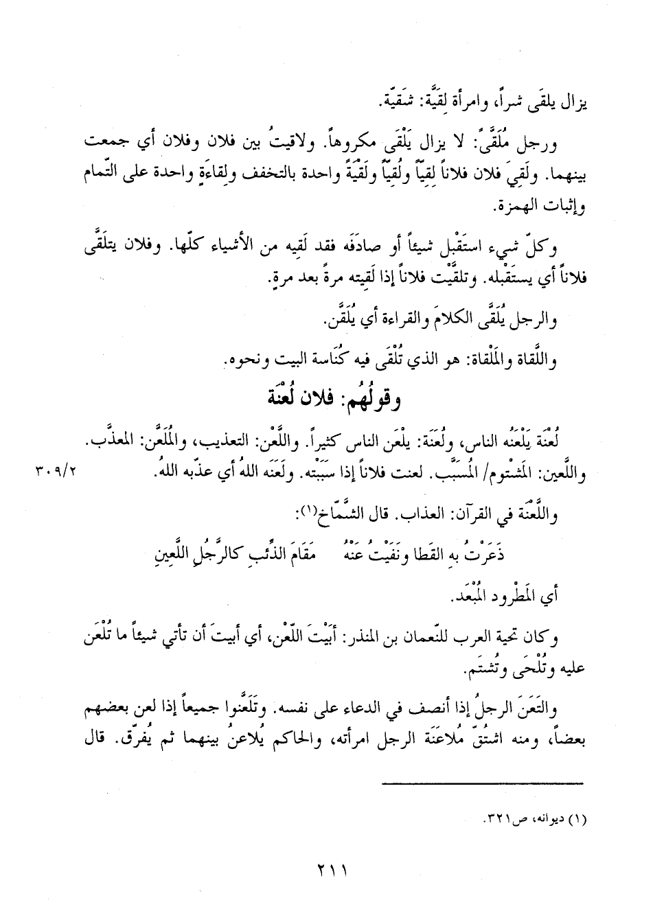 ورجل ملقَّى: لا يزال يلقى مكروهاً. ولاقيت بين فلان وفلان أي جمعت بينهما. ولقي فلان فلاناً لِقياً ولُقياً ولَقْية واحدة بالتخفف ولقاءة واحدة على التمام وإثبات الهمز.
