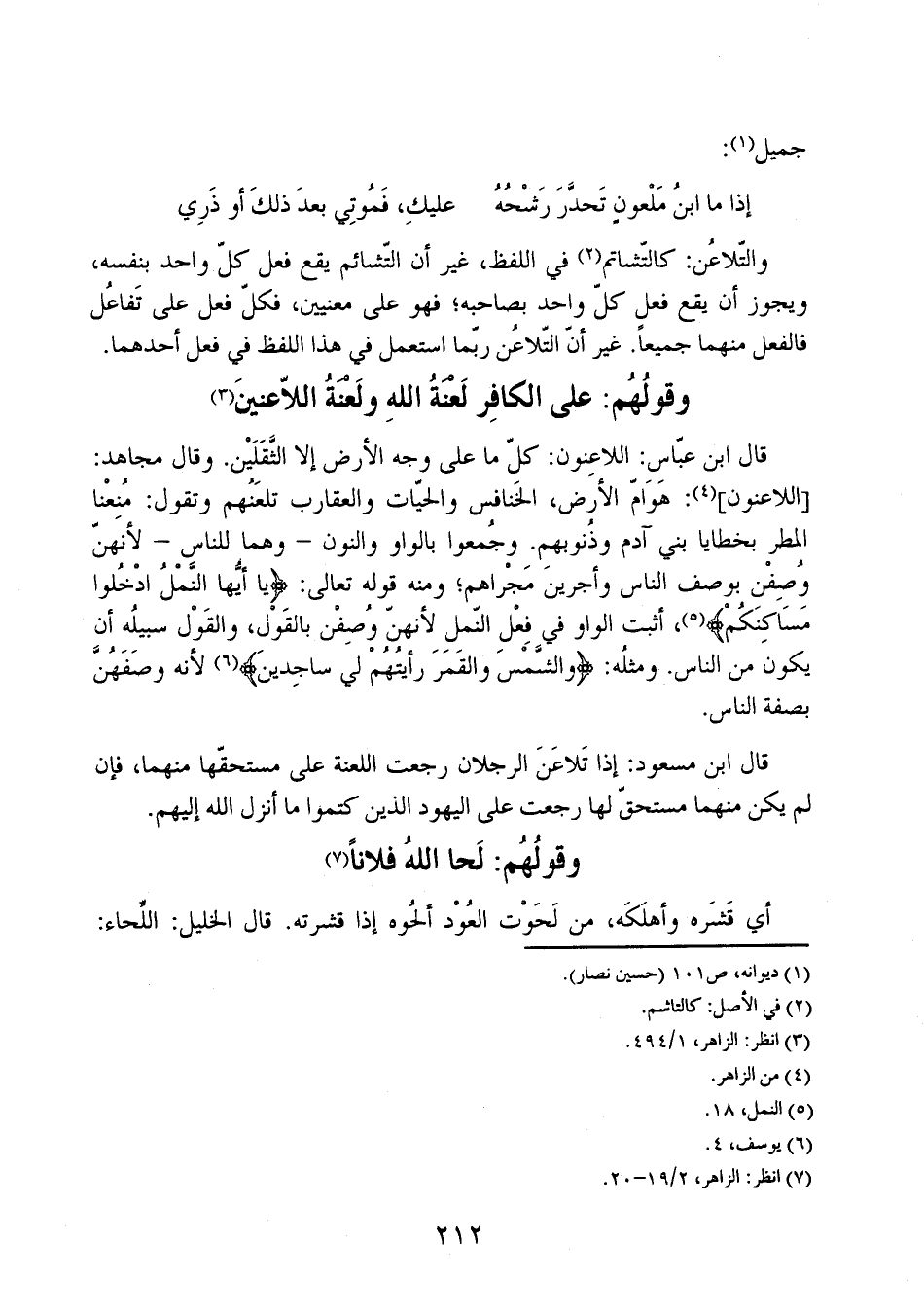 قال ابن عباس: اللاعنون: كل ما على وجه الأرض إلا الثقلين. وقال مجاهد: [اللاعنون]: هوام الأرض، الخنافس والحيات والعقارب تلعنهم وتقول: منعنا المطر بخطايا بني آدم وذنوبهم. وجمعوا بالواو والنون- وهما للناس- لأنهن وُصفن بوصف الناس وأجرين مجراهم؛ ومنه قوله تعالى: {يَا أَيُّهَا النَّمْلُ ادْخُلُوا مَسَاكِنَكُمْ}، أثبت الواو في فعل النمل لأنهن وصفن بالقول، والقول سبيله أن يكون من الناس. ومثله: {وَالشَّمْسَ وَالْقَمَرَ رَأَيْتُهُمْ لِي سَاجِدِينَ} لأنه وصفهن بصفة الناس.