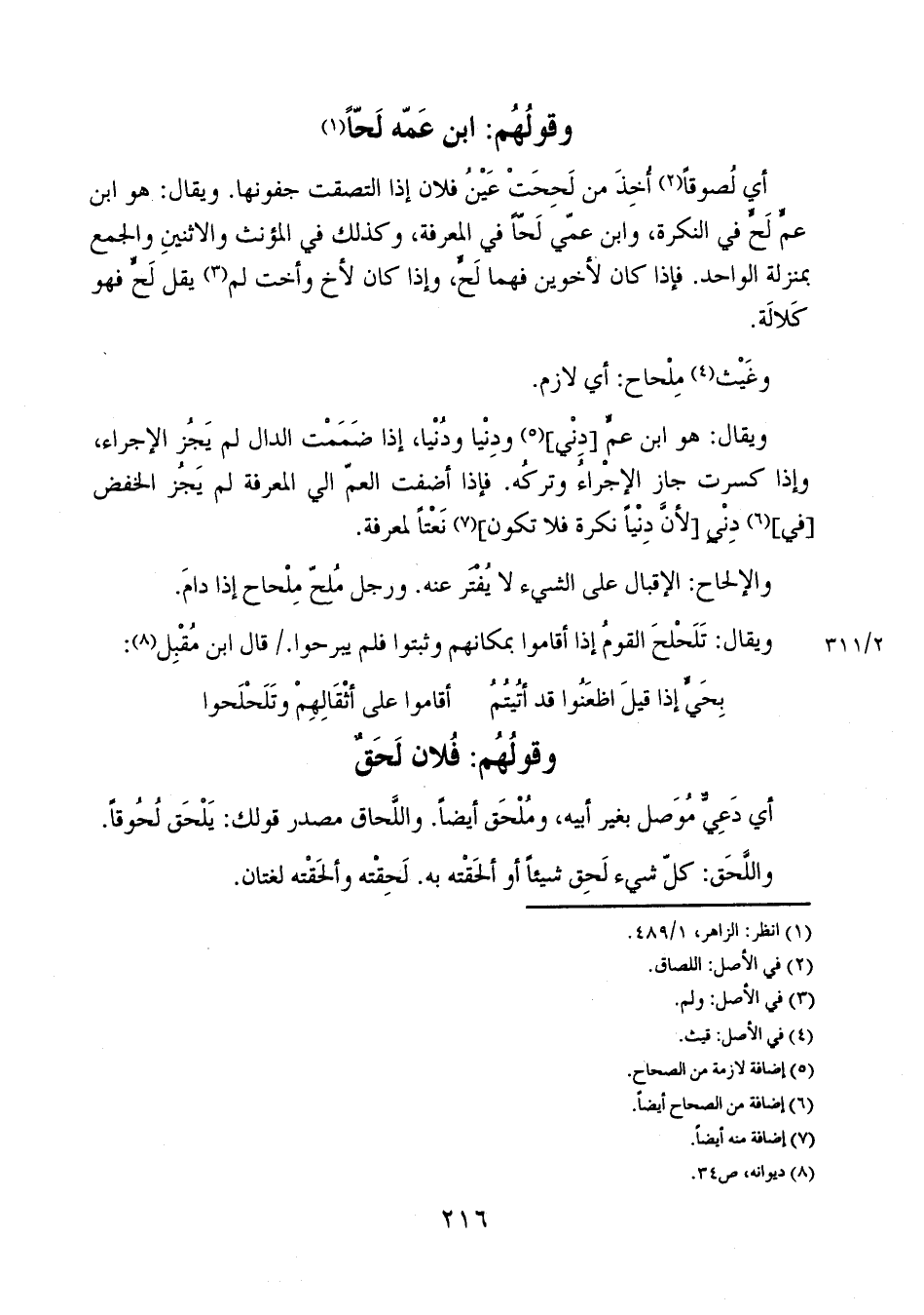 أي لصوقاً أخذ من لححت عين فلان إذا التصقت جفونها. ويقال: هو ابن عم لح في النكرة، وابن عمي لحاً في المعرفة، وكذلك في المؤنث والاثنين والجمع بمنزلة الواحد. فإذا كان لأخوين فهما لح، وإذا كان لأخ وأخت لم يقل لح فهو كلالة.