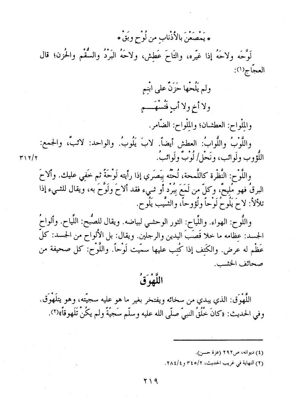 واللُّوح: الهواء. واللياح: الثور الوحشي لبياضه. ويقال للصبح: اللياح. وألواح الجسد: عظامه ما خلا قصب اليدين والرجلين. ويقال: بل الألواح من الجسد: كل عظم له عرض. والكتف إذا كُتِب عليها سميت لوحاً. واللوح: كل صحيفة من صحائف الخشب.