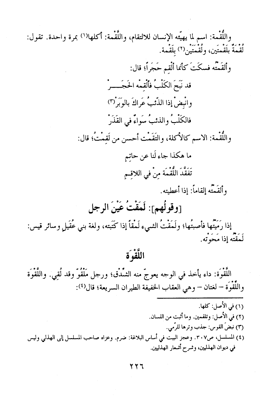 واللقمة: اسم لما يهيئه الإنسان للالتقام، واللقمة: أكلها بمرة واحدة. تقول: لقمة بلقمتين، ولقمتين بلقمة.