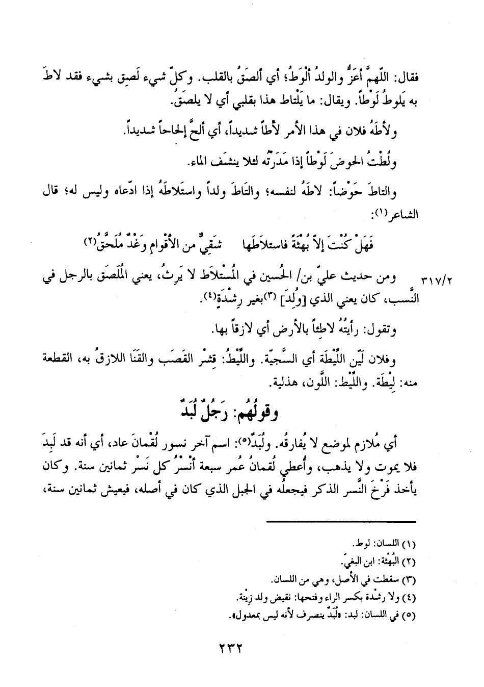 فقال: اللهم أعز والولد ألوط؛ أي ألصق بالقلب. وكل شيء لصق بشيء فقد لاط به يلوط لوطاً. ويقال: ما يلتاط هذا بقلبي أي لا يلصق.
