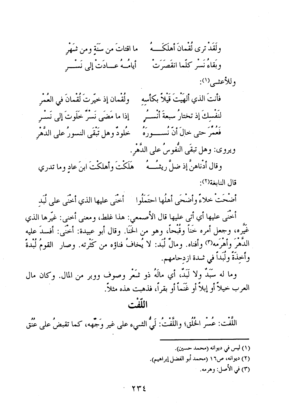 أخنى عليها أي أتى عليها قال الاصمعي: هذا غلط، ومعنى أخنى: غيرها الذي غيَّره، وجعل أمره خناً وقُبحاً، وهو من الخنا. وقال أبو عبيدة: أخنى: أفسد عليه الدهر وأهرمه وأفناه. ومال لبد: لا يخاف فناؤه من كثرته. وصار القوم لبدة وأخذة ولبداً في شدة ازدحامهم.