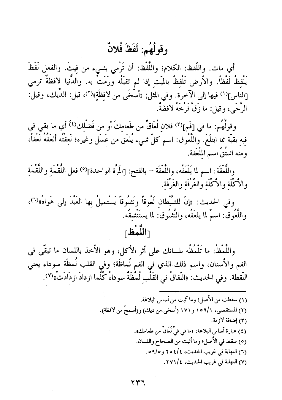 أي مات. واللفظ: الكلام؛ واللفظ: أن ترمي بشيء من فيك. والفعل لفظ يلفظ لفظاً. والأرض تلفظ بالميت إذا لم تقبله ورمت به. والدنيا لافظة ترمي [الناس] فيها إلى الآخرة. وفي المثل: "أسخى من لافظة"، قيل: الديك، وقيل: الرحى، وقيل: ما زقَّ فرخه لافظة.