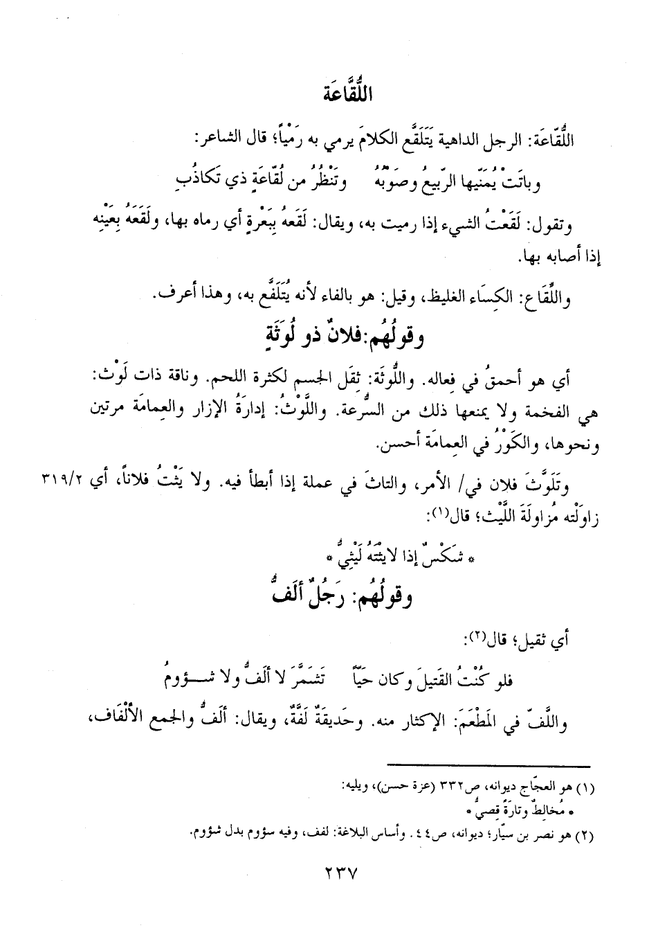 أي هو أحمق في فعاله. واللوثة: ثقل الجسم لكثرة اللحم. وناقة ذات لوث: هي الفخمة ولا يمنعها ذلك من السرعة. واللوث: إدارة الإزار والعمامة مرتين ونحوها، والكوْرُ في العمامة أحسن.