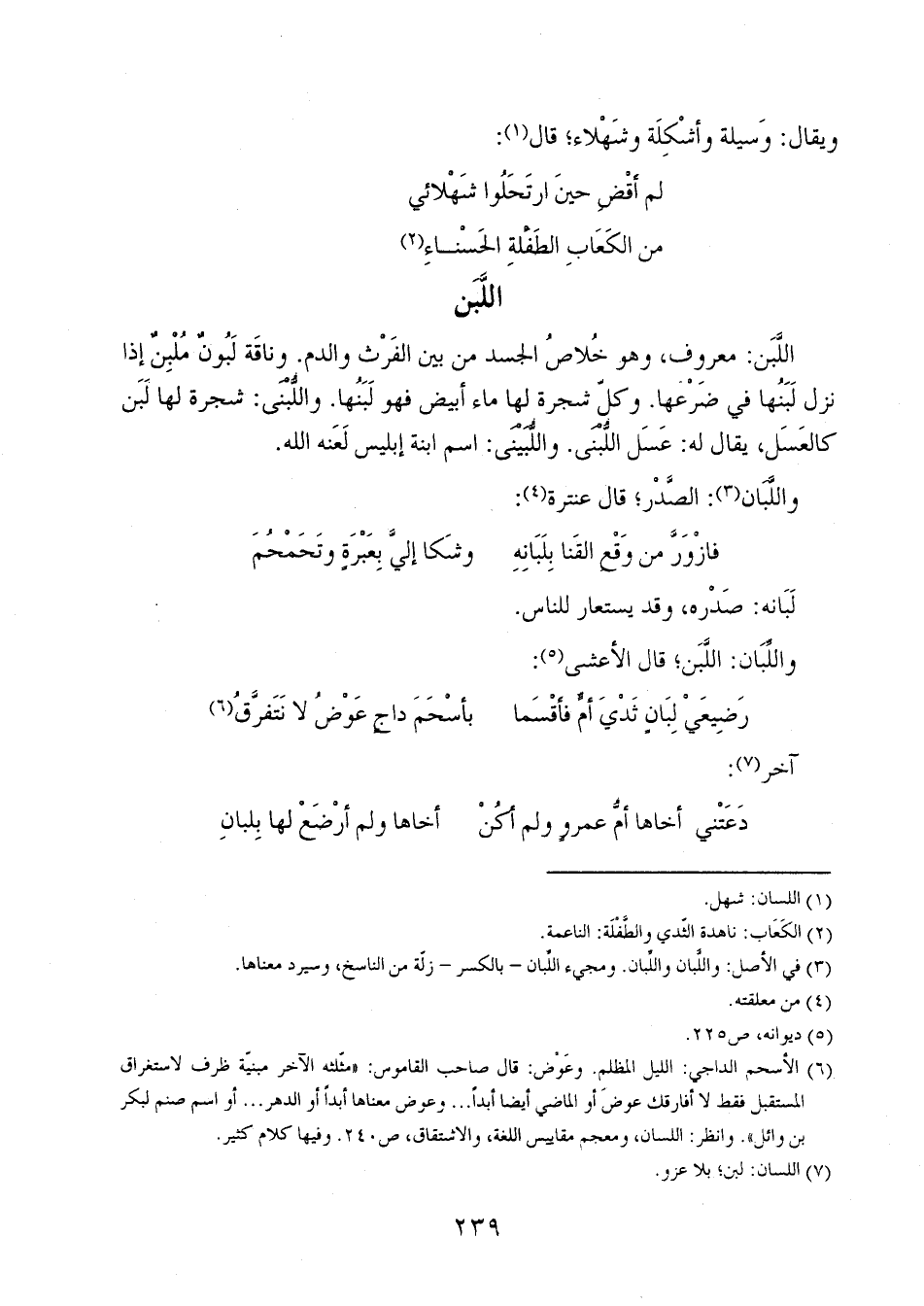 اللبن: معروف، وهو خلاص الجسد من بين الفرث والدم. وناقة لبون مُلْبِن إذا نزل لبنها في ضرعها. وكل شجرة لها ماء أبيض فهو لبنها. واللبْنَى: شجرة لها لبن كالعسل، يقال له: عسل اللبنى. واللبينى: اسم ابنة إبليس لعنه الله.