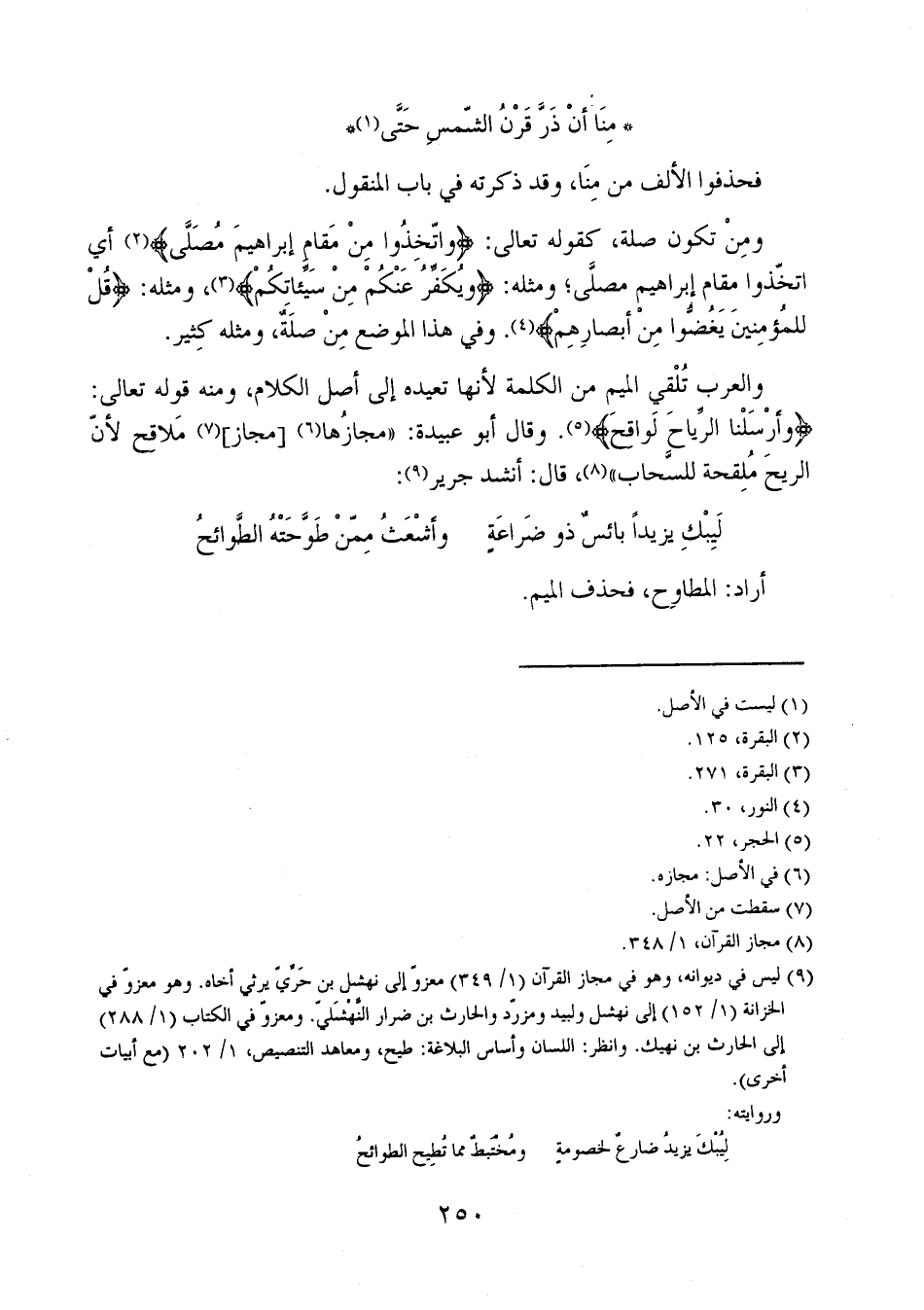 والعرب تُلقي الميم من الكلمة لأنها تعيده إلى أصل الكلام، ومنه قوله تعالى: {وَأَرْسَلْنَا الرِّيَاحَ لَوَاقِحَ}. وقال أبو عبيدة: "مجازها [مجاز] ملاقح لأن الريح ملقحة للسحاب"، قال: أنشد جرير:
