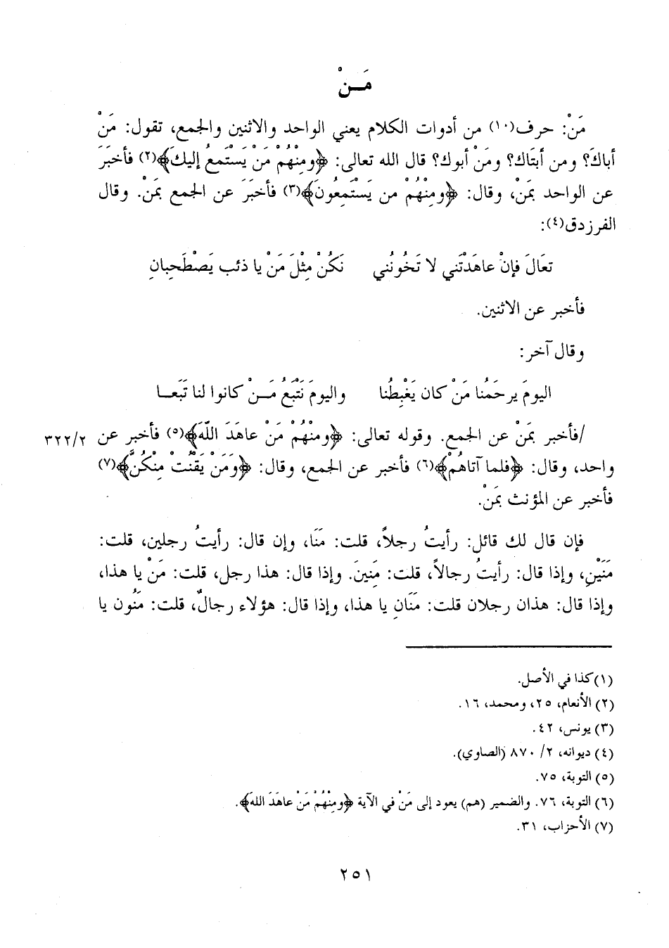 مَنْ: حرف من أدوات الكلام يعني الواحد والاثنين والجمع، تقول: مَنْ أباك؟ ومن أبتاك؟ ومن أبوك؟ قال الله تعالى: {وَمِنْهُمْ مَنْ يَسْتَمِعُ إِلَيْكَ} فأخبر عن الواحد بمَنْ، وقال: {وَمِنْهُمْ مَنْ يَسْتَمِعُونَ} فأخبر عن الجمع بمَنْ. وقال الفرزدق: